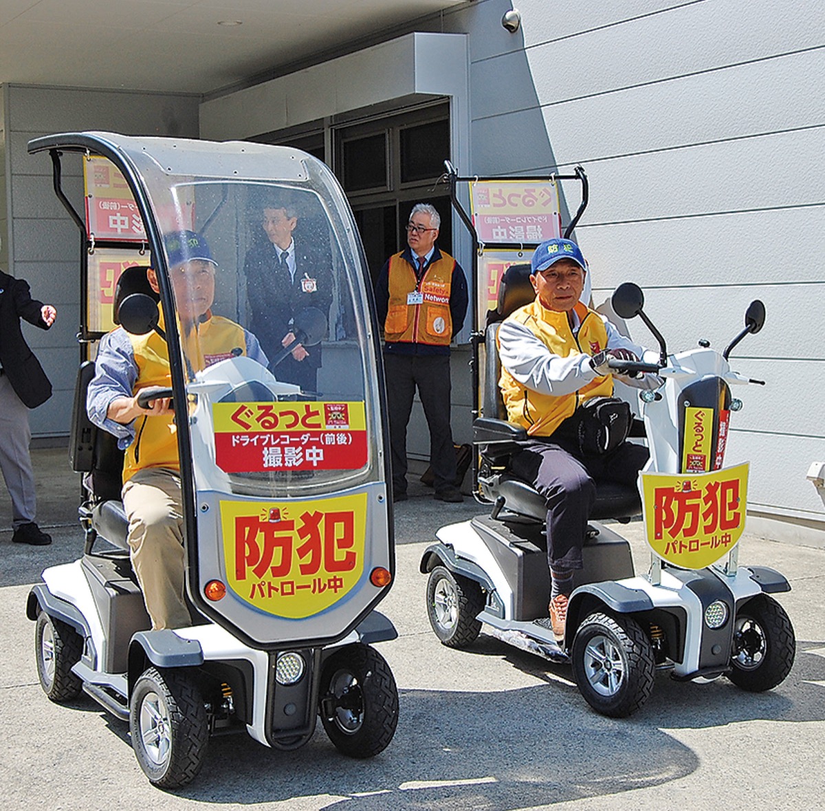 21日の出発式には市と財団関係者らが出席。同法人の武井主税代表理事は「町内の人が防犯意識を持てるように、ゆっくり走るモビリティスクーターでパトロールしていきたい」とあいさつ。パトロール用に改良された車2台のスクーターが地域に向けて出発した。