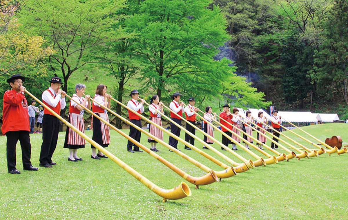芝生広場ではアルプホルンやオカリナ、フラダンスなどの野外コンサートを開催。焼きそばの販売やキッチンカーの出店、竹とんぼ作り、アウトドア太極拳や木工の体験も楽しめる。