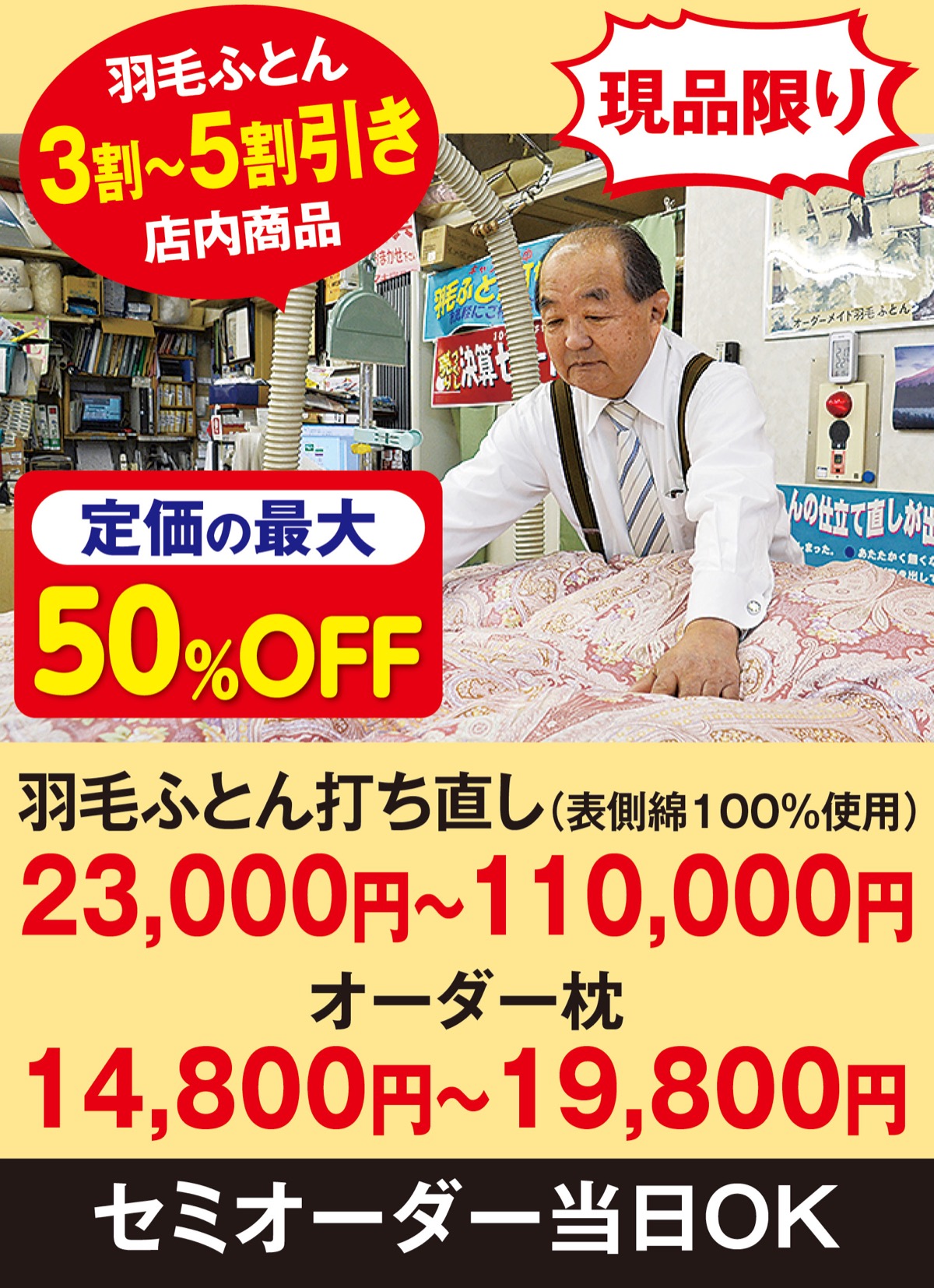 「羽毛ふとんの打ち直し」をはじめオーダー枕、ふとんカバー、シーツ、今治タオル、ガーゼパジャマなど店内にあるものなら最大半額で購入可能だ。親切丁寧なサービス提供と、豊富な知識が魅力のベテランの店主に気軽に相談を。