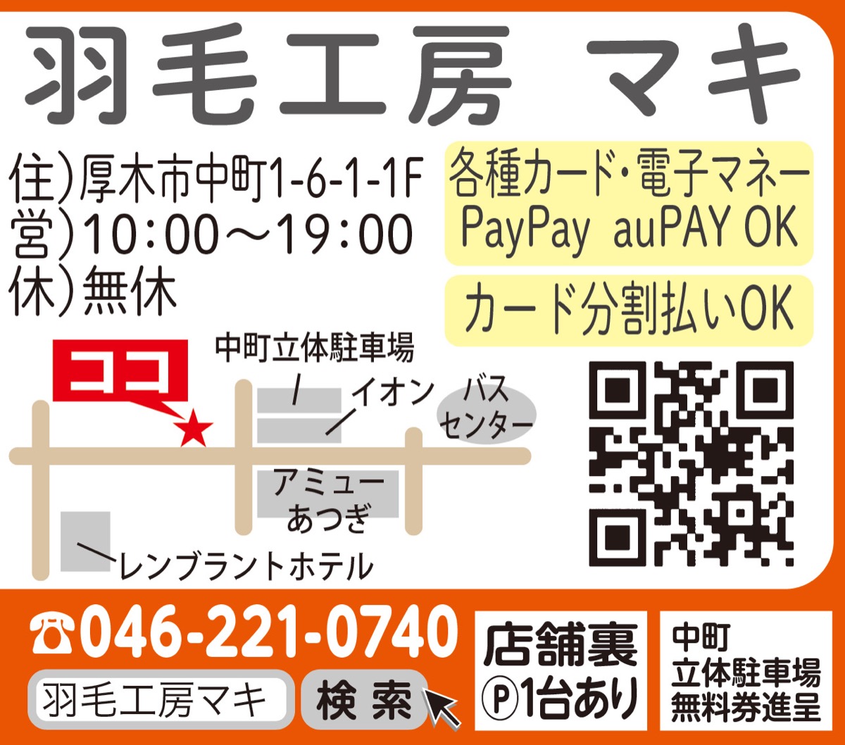 本厚木駅東口から徒歩3分の創業75年・羽毛工房マキでは5月31日(土)まで在庫一掃売り尽くしセールを開催中。