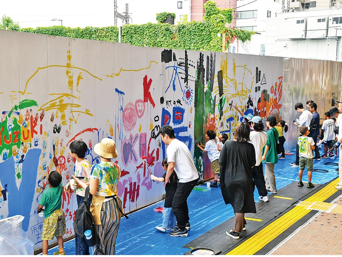 市役所新庁舎などが入る複合施設建設地の仮囲いで、厚木市出身のアーティスト・井上純さんと市民が絵を描くワークショップが5月18日に開催された。