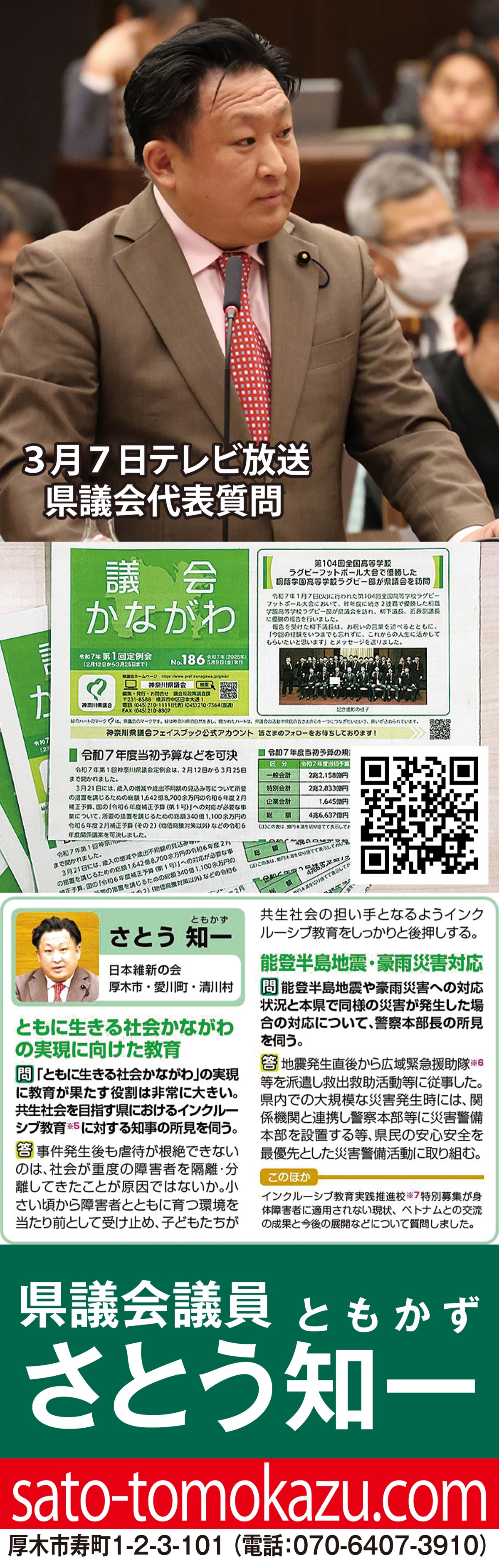 5月9日発行の「議会かながわ」に「さとう知一代表質問」の答弁要旨と概要が掲載されています。