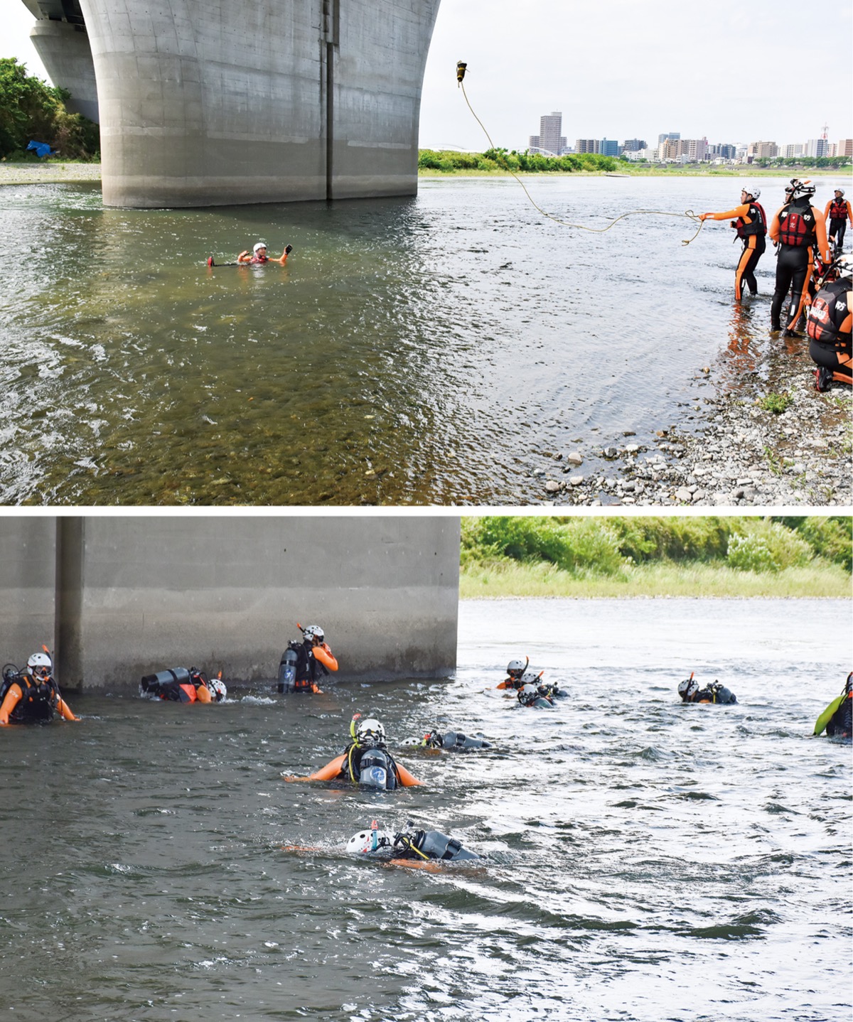 ウェットスーツを着た隊員らは、浮力体が付いた「スローバッグ」と呼ばれる救助用ロープを要救助者役に向かって投げ入れる訓練や、泳いで助けに向かう手順を実践した。その後は潜水資機器材を装着し、川に入水して潜水訓練を開始。水中の視界や川底の状況、水深、流れの速い危険な箇所などを確認した。