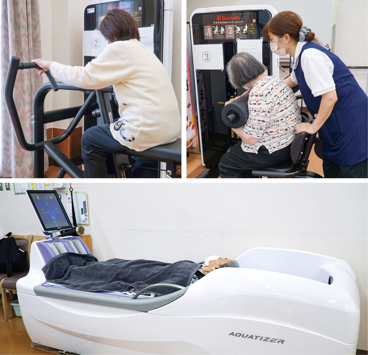 併設するデイサービスは、この3月から最新のリハビリ機器3種と体をほぐすウォーターマッサージベッドやマッサージ器を導入した。