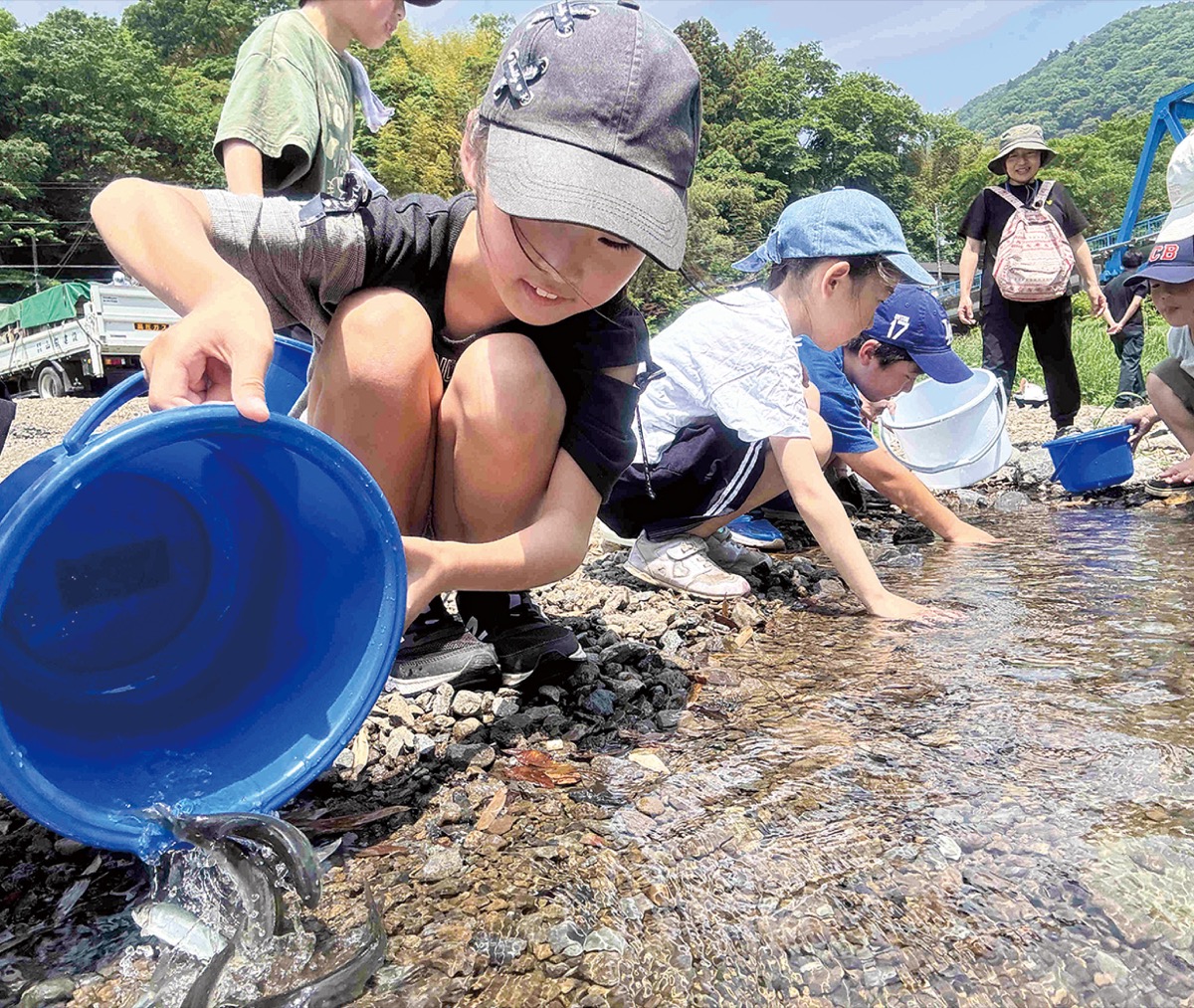 児童らは「アユがつるつるしている」「いっぱいとび跳ねておもしろい」と笑顔を見せながら、体長10センチほどの稚アユを放流していった。様子を見守った木藤会長には「アユはどれぐらいで大きくなりますか」「アユはどのくらい寝るんですか」と質問が寄せられた。