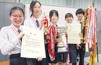 珠算の部では、柳田心優さん、伊藤楓さん、細川遼祐さんの2年生3人がチームを組み、昨年同様のメンバー構成で2連覇を達成。同部で珠算に取り組むのは3人のみで、細川さんは「全国大会で入賞し、校内に珠算の魅力とかっこよさを伝えたい」と、珠算に取り組む人が増えることを願って全国大会に挑む。