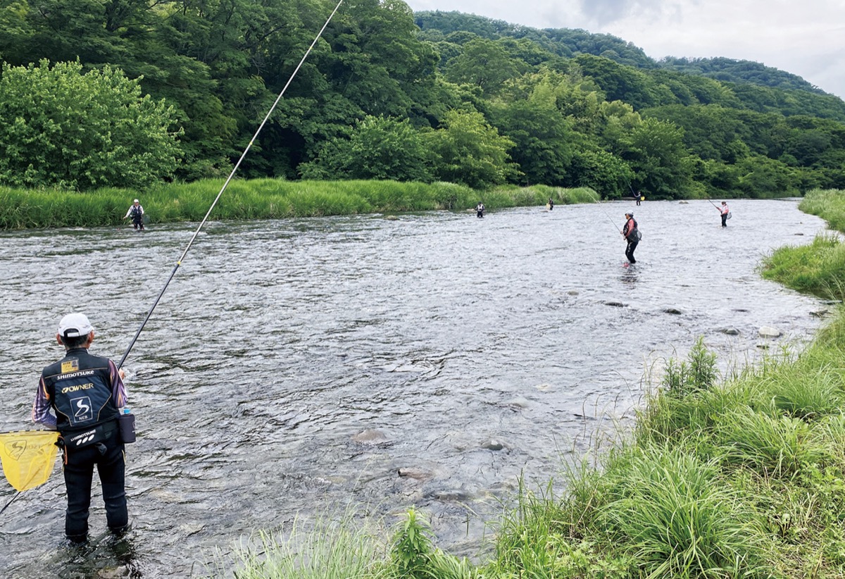 相模川水系でアユ釣りが6月1日に解禁され、水域では多くの釣り人が竿(さお)を振る姿が見られる。