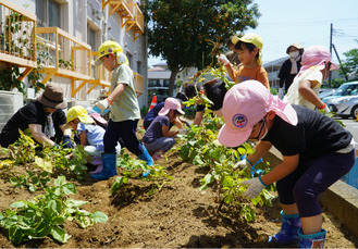 障害者支援施設「愛名やまゆり園」に6月19日、保育園コスモスの4、5歳児クラスの園児12人と職員、保護者らが訪れ、ジャガイモ掘りを楽しんだ。