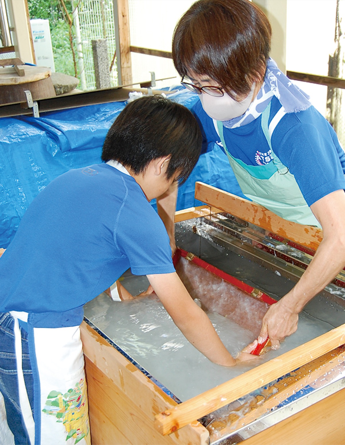 この日、児童たちは同会の会員から手ほどきを受けながら、原料の楮(こうぞ)が溶かれた「漉き舟(すきぶね)」と「漉桁(すきげた)」を使い、慎重に紙を漉き上げた。世界に一つだけの卒業証書となる一枚を、真剣な表情で作り上げていた。