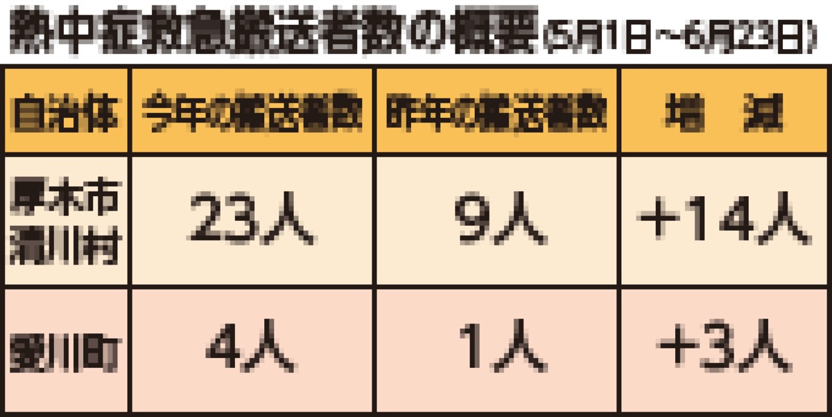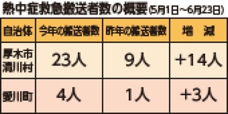 気温の上昇が著しくなる季節を迎え、厚木市と愛川町消防本部管内では熱中症による救急搬送が増加している。両本部が統計を開始した5月1日から6月23日までの熱中症搬送者数は厚木市管轄では23人、愛川町では4人だった。両消防本部では暑さが本格化する7月、8月を前に、「熱中症対策を徹底してほしい」と警戒を呼びかけている。
