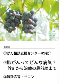 当日は同院呼吸器科の竹内真吾診療科長が講師を務め「肺がんの診断から治療の最前線まで」と題して肺がんの解説。また同院がん相談支援センター相談員によるセンターの説明もある。同院では「参加者の皆さんと交流する時間を設けています。お気軽にご参加ください」と話す。