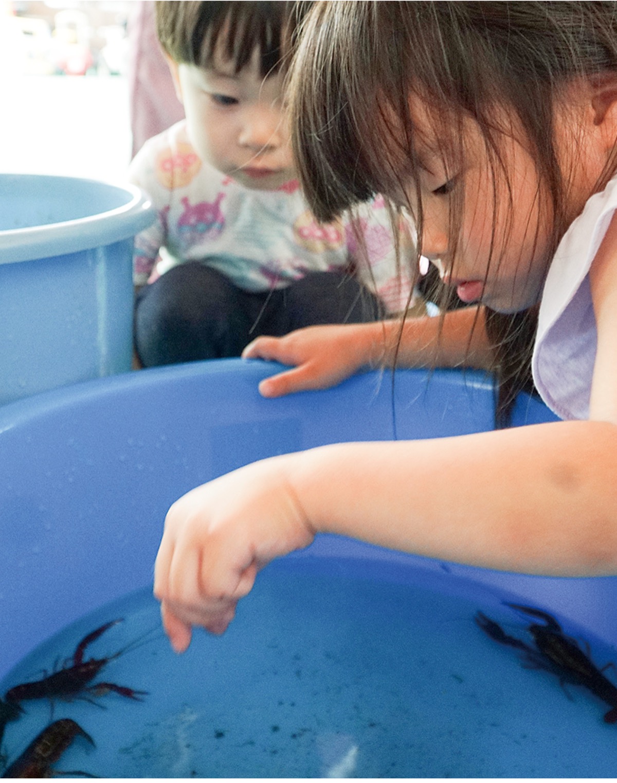 厚木市愛名にある保育園コスモス(安立香織園長)の園庭で6月25日、初めての試みとなる「恩曽川のミニミニ水族館」が開催された。