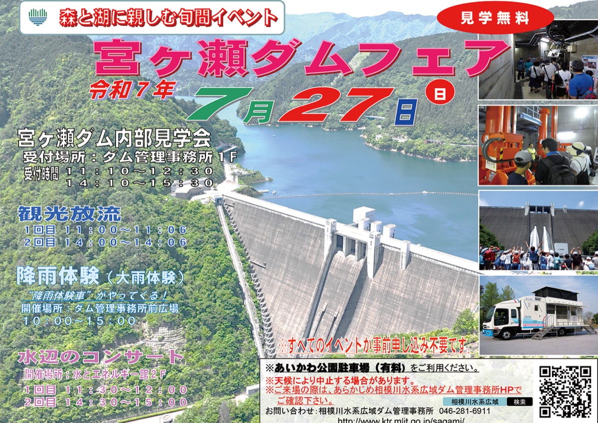 また台風時の大雨を実際に体験することができる「降雨体験車」を用意(先着順)するほか、水とエネルギー館でも木管五重奏団による水辺のコンサートが開かれる。趣向を凝らした様々な企画が予定され、ダムで1日を過ごすことができる。事前申し込み不要。