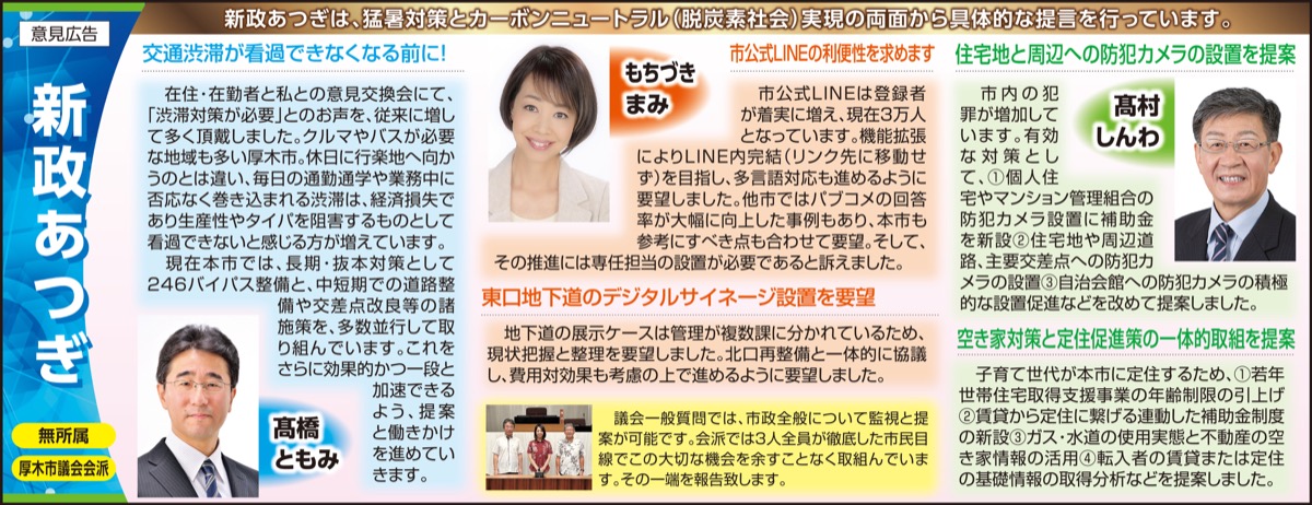 在住・在勤者と私との意見交換会にて、「渋滞対策が必要」とのお声を、従来に増して多く頂戴しました。クルマやバスが必要な地域も多い厚木市。休日に行楽地へ向かうのとは違い、毎日の通勤通学や業務中に否応なく巻き込まれる渋滞は、経済損失であり生産性やタイパを阻害するものとして看過できないと感じる方が増えています。 現在本市では、長期・抜本対策として246バイパス備と、中短期での道路整備や交差点改良等の諸施策を、多数並行して取り組んでいます。これをさらに効果的かつ一段と加速できるよう、提案と働きかけを進めていきます。