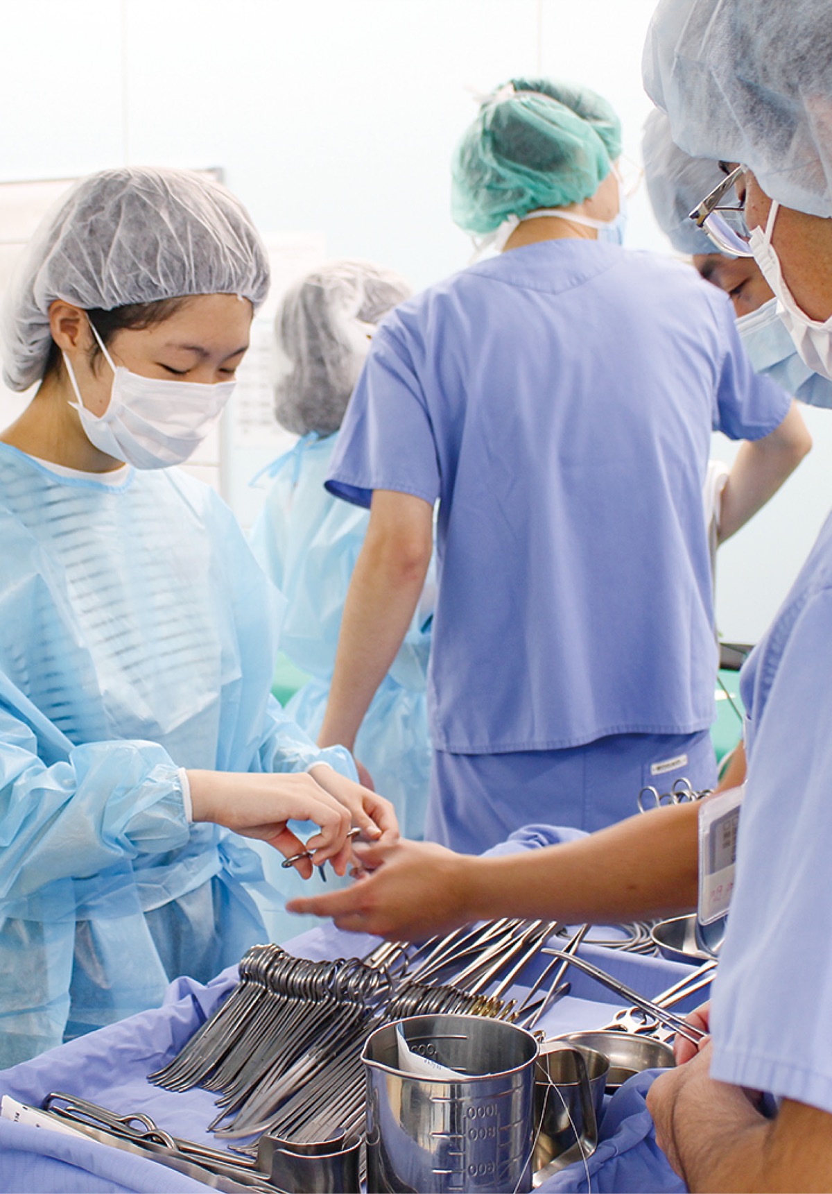 当日は同院ロボット手術センターの岩村正嗣医師をはじめ、看護師や臨床工学技士が参加。学生たちは腹腔鏡手術とロボット手術の違いについて学んだほか、実際の手術器具に触れ、その使い方や医療機器の仕組みなどを教わった。