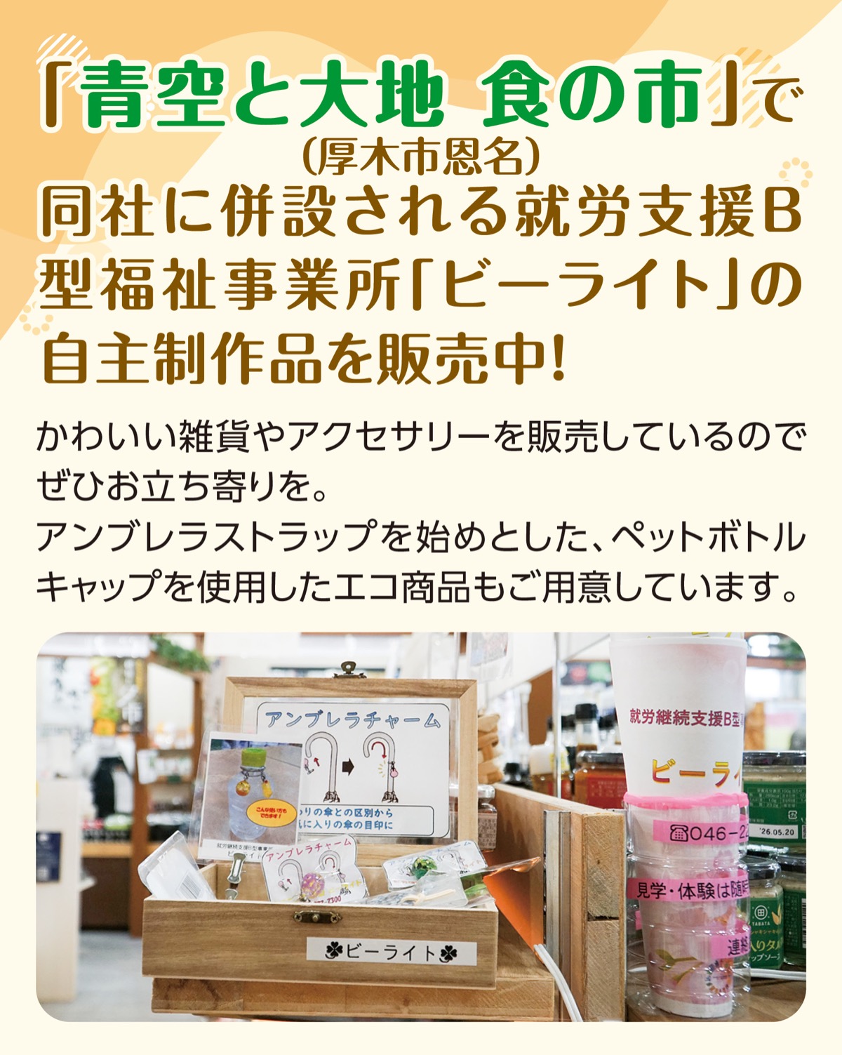 現在、本厚木ミロード4階でエコキャップの回収ボックスが設置され、同社はアート制作に不足するエコキャップの提供と、イベント終了後のエコキャップの引き取りを行う。