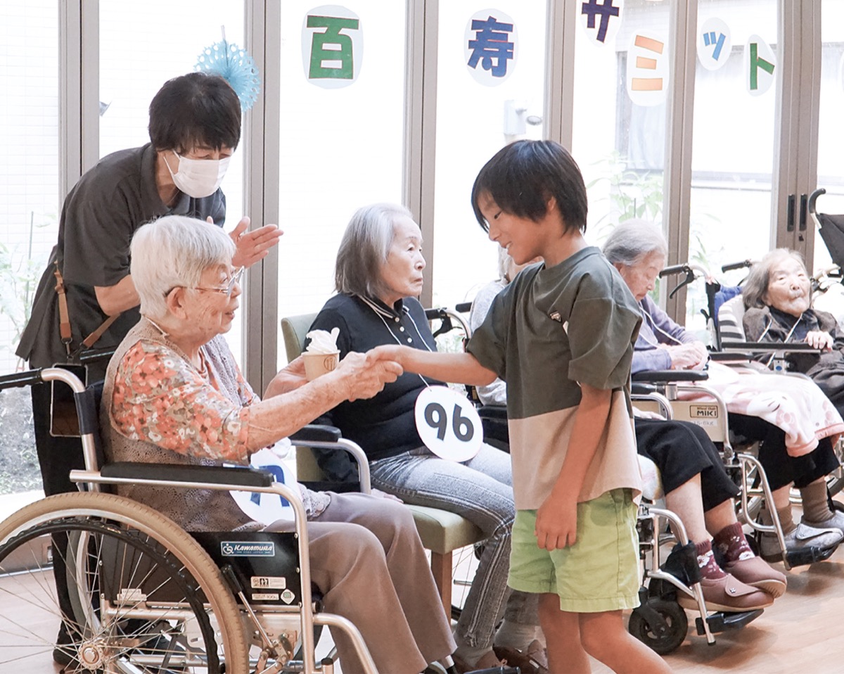 当日は100歳から95歳までの入居者13人、その家族、地域住民、職員とその子どもたち(中学生〜保育園児)など、約50人が参加した。