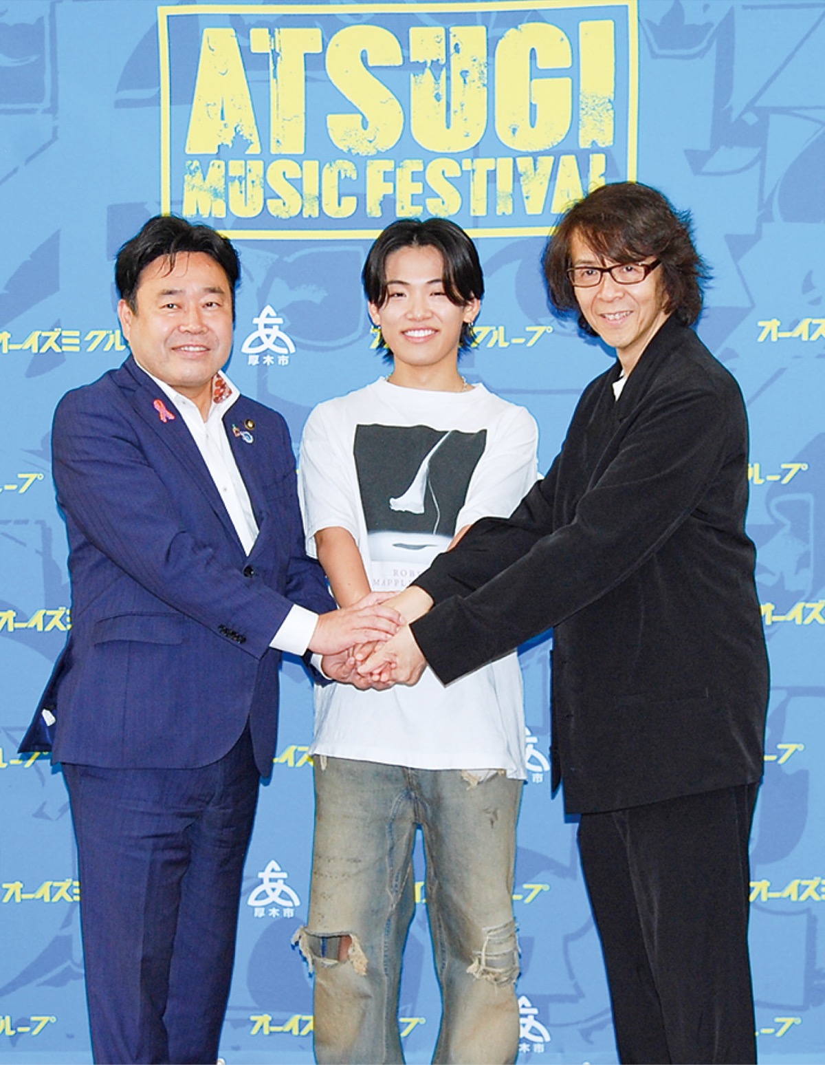 会見には、実行委員長の横内謙介さん、山口貴裕厚木市長のほか、同フェスをきっかけにメジャーデビューした市内出身アーティストの舟津真翔さんらが登壇。第1弾出演アーティストとして木梨憲武さんと舟津さんの2組が発表された。