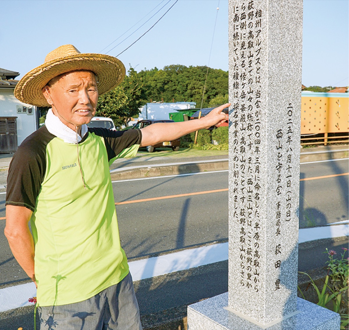 2004年に結成された西山を守る会(荻田豊事務局長)は、創設20周年の活動の証として、事務局前の国道412号線沿いに「相州アルプス・西山三山」の碑を建立した。登山者の益々の増加を祈念する意味も込められている。