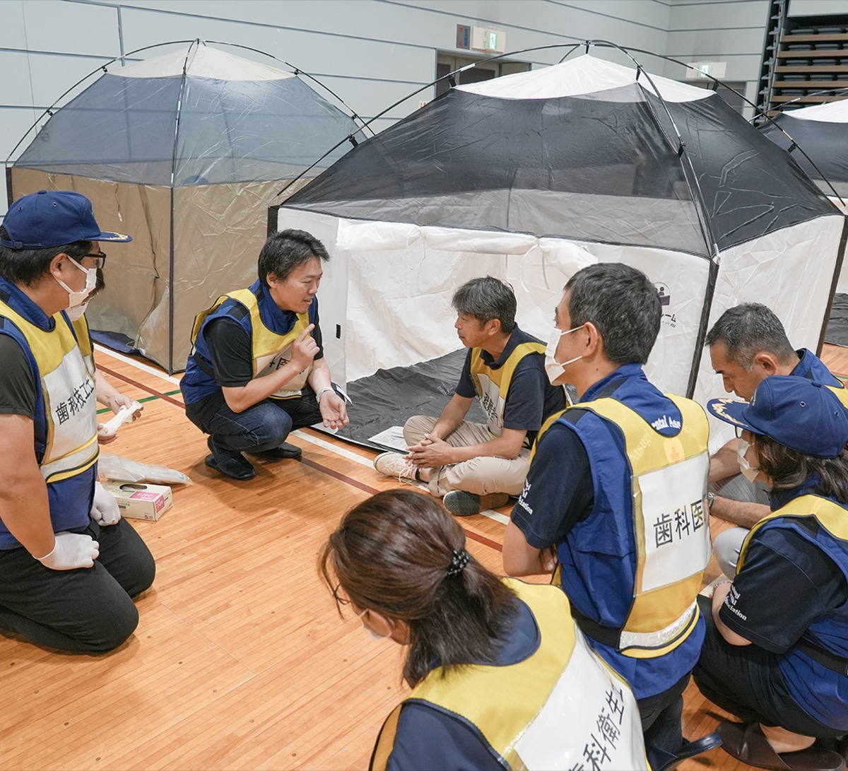 この日は市職員を始め歯科医師や歯科技工士、歯科衛生士などのほか保健師や看護師、薬剤師、栄養士などが参加。テントの中の避難者役を訪ねて回り、安否確認を兼ねて現在の体調や困りごとなどを聞き取った。その結果、口腔ケアや義歯の修理、歯の治療や投薬が必要となった場合には、関係機関と連携し、繋いでいくという流れを確認した。