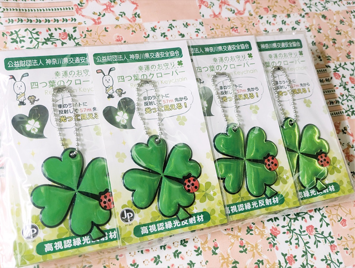 寄贈された「高視認緑光反射材」は、夜間に着用すると57m離れた車のライトなどに反射するもので、交通事故防止の一助となる。また、四つ葉のクローバーの形が特徴で、ランドセルやバッグに付けることができる。