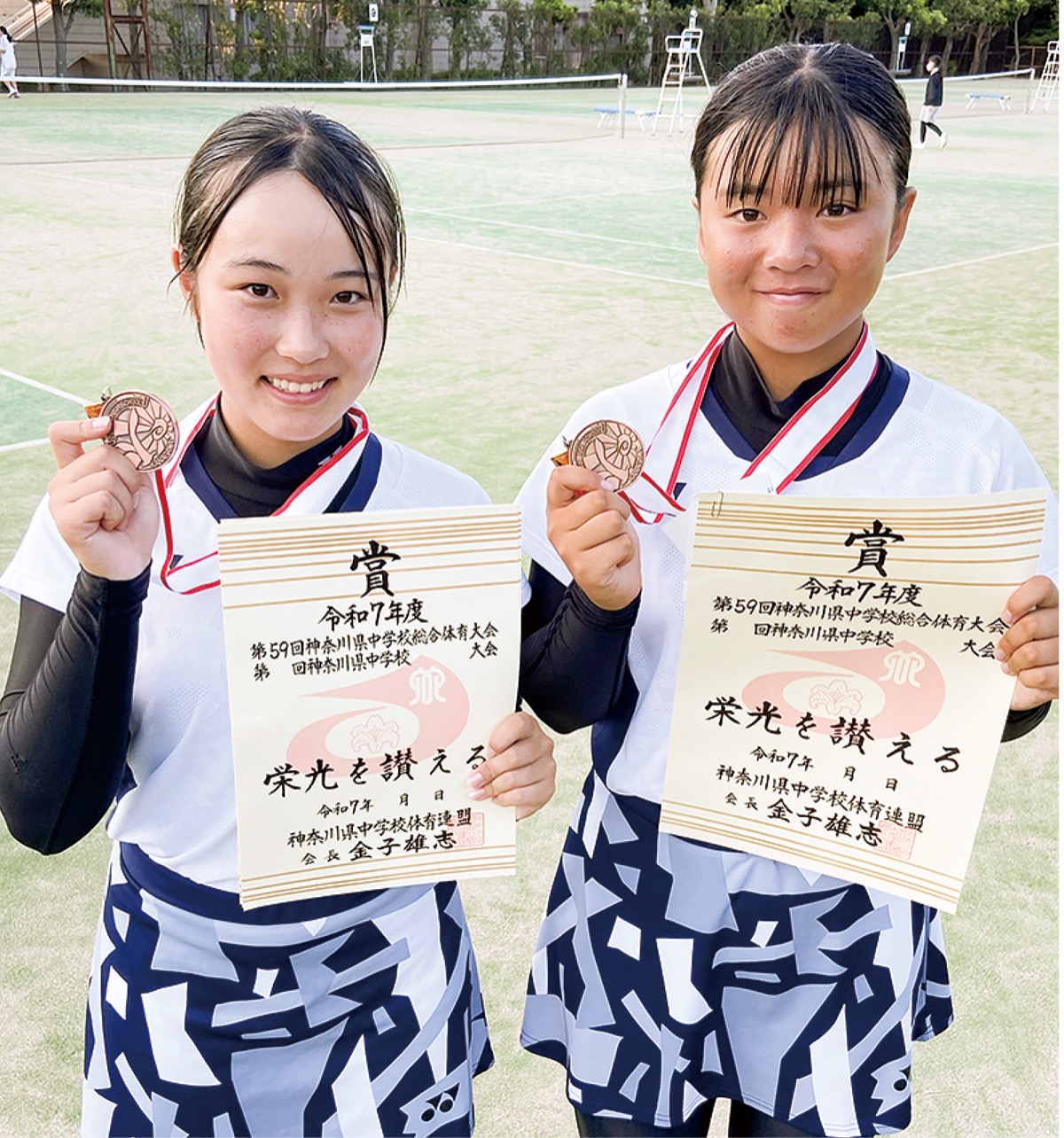 厚木市立東名中学校女子ソフトテニス部の那須柚月さんと遠藤未桜さん(ともに3年)ペアがこのほど、第61回神奈川県中学校ソフトテニス大会で個人戦3位入賞を果たし、8月の関東大会に出場した。
