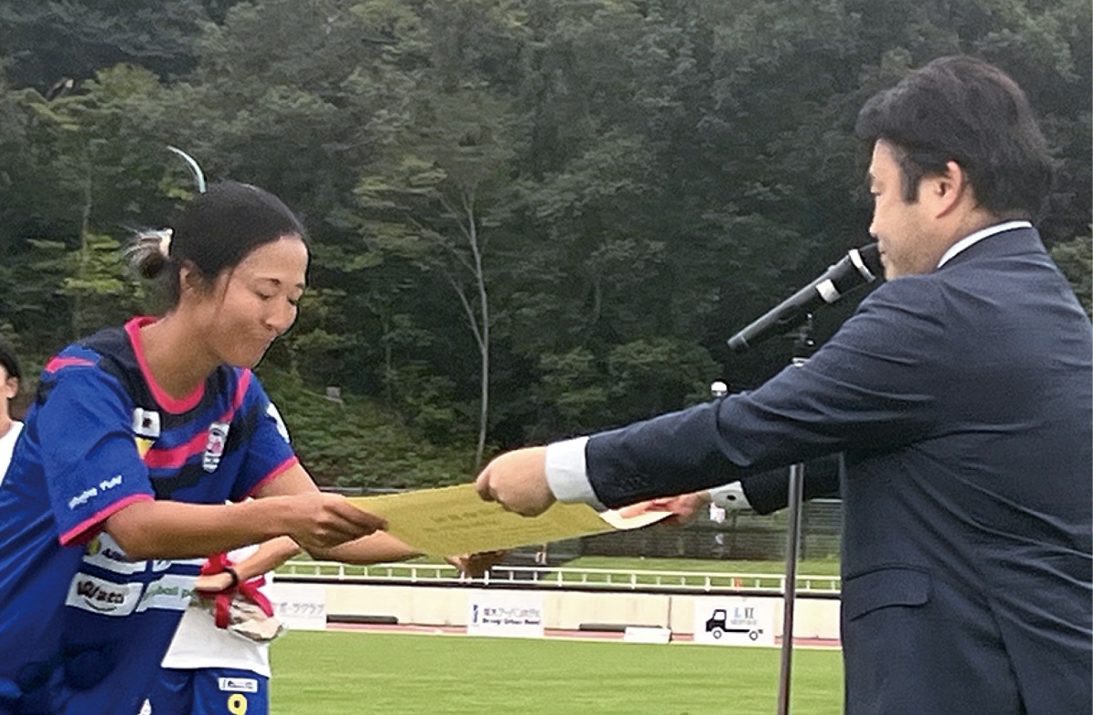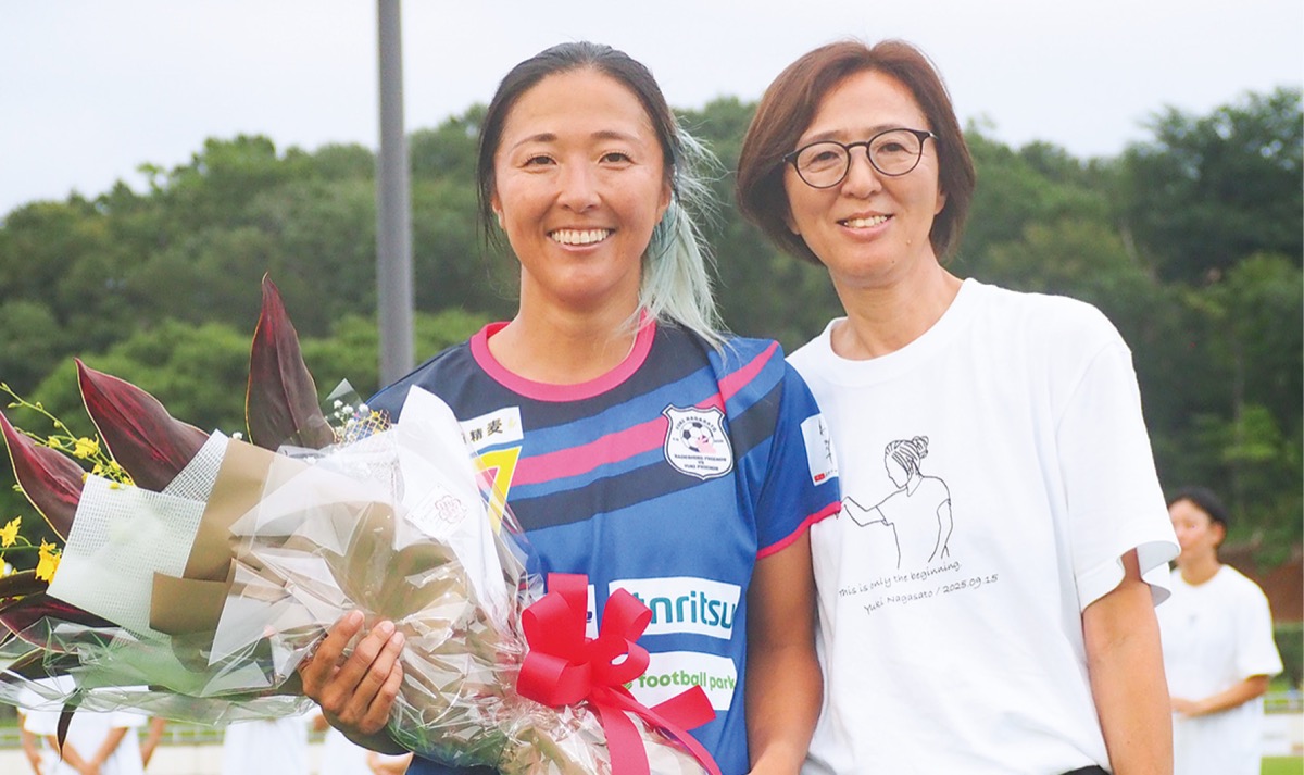 試合後に開かれたセレモニーでは母の美智子さんから花束が手渡され、抱擁する姿も。厚木市からは特別感謝状が贈呈された。あいさつに立った永里優季さんは「サッカー人生、楽しいことより辛いことの方が多かったが、素晴らしい仲間と出会えたことが宝物。最後までやり抜いたことは自信になった。最高のサッカー人生でした」と笑顔で締めくくった。