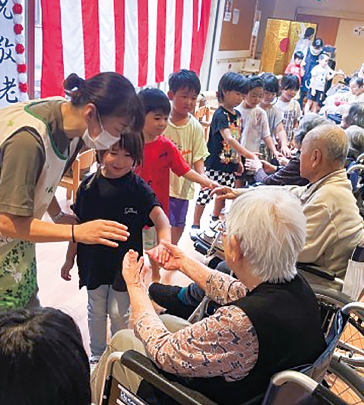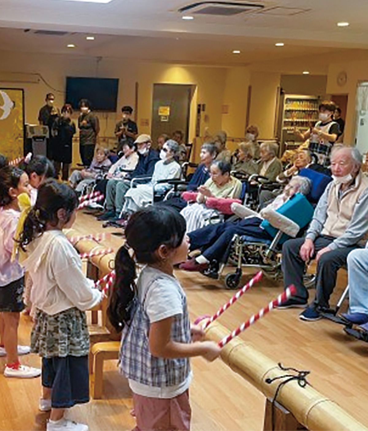 園児たちは、この日のために練習を重ねてきた竹太鼓によるソーラン節を元気いっぱいに演奏。園児が心を込めて叩いた音色は、利用者の心を打ち、園児にとびきりの笑顔と大きな拍手が送られた。99歳を迎える小島シゲさんは、「可愛い演奏で、こんなにうれしいことはない。これからもまだまだ元気でいられます」と語った。