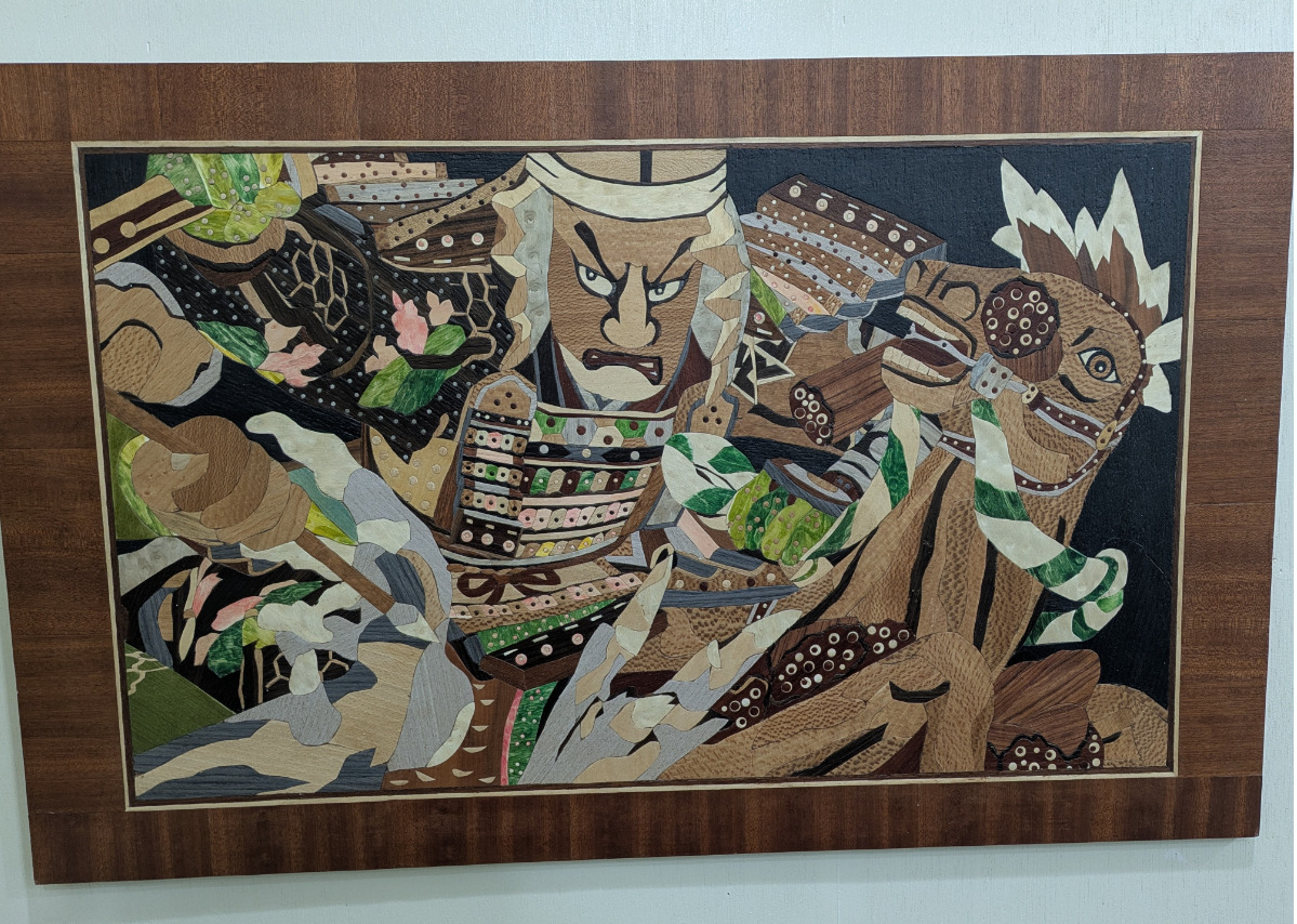 木の象嵌は、木材をカッターで切り抜き、はめ込んで完成させるヨーロッパの伝統工芸。会場には、イタリアから輸入した木片や染色された木片など、天然の木が持つ自然な色合い、木目を生かした絵画作品が並ぶ。
