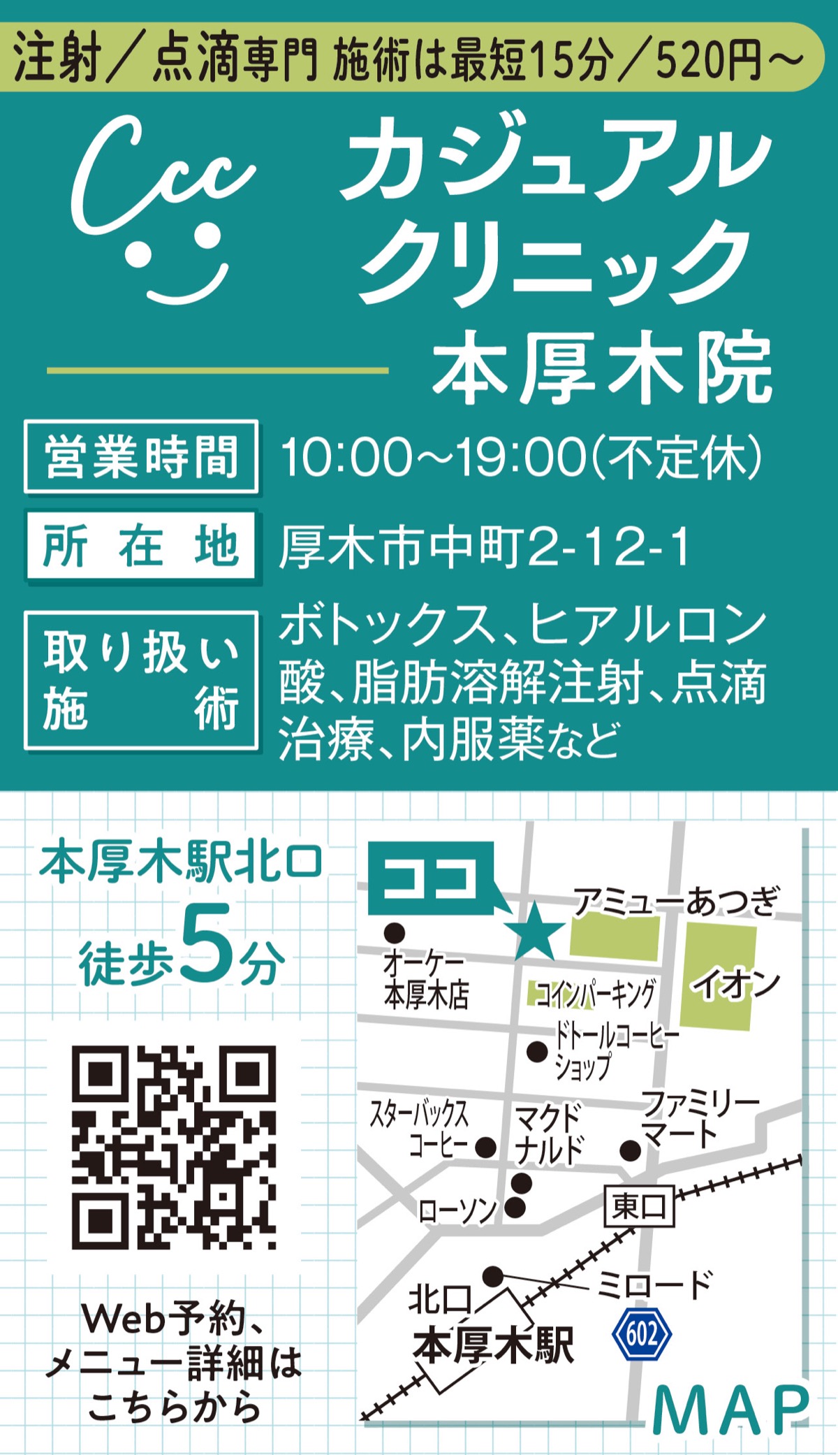 ボトックスなどの美容注射・点滴専門「カジュアルクリニック」が10月1日、本厚木駅北口徒歩5分の場所に開院した。