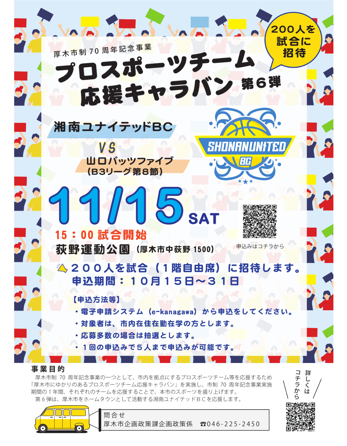 今回は、市をホームタウンとする男子プロバスケットボールB3リーグ所属「湘南ユナイテッドBC」の公式戦で、11月15日(土)、荻野運動公園メインアリーナ(厚木市中荻野1500)で山口パッツファイブと対戦する試合(B3リーグ第8節)に、市民200人を無料で招待する。試合開始は午後3時。