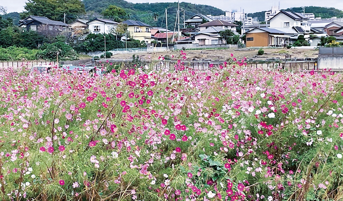 このコスモス畑は、地元の中荻野に住む落合耕一さんが所有する元水田で3年前に稲作をやめた際、近隣の障害者施設の利用者やボランティアと一緒に、水田にコスモスの種を蒔いた。落合さんは「今月いっぱいはコスモスを楽しめるだろう」と話しており、道行く人々の目を楽しませている。