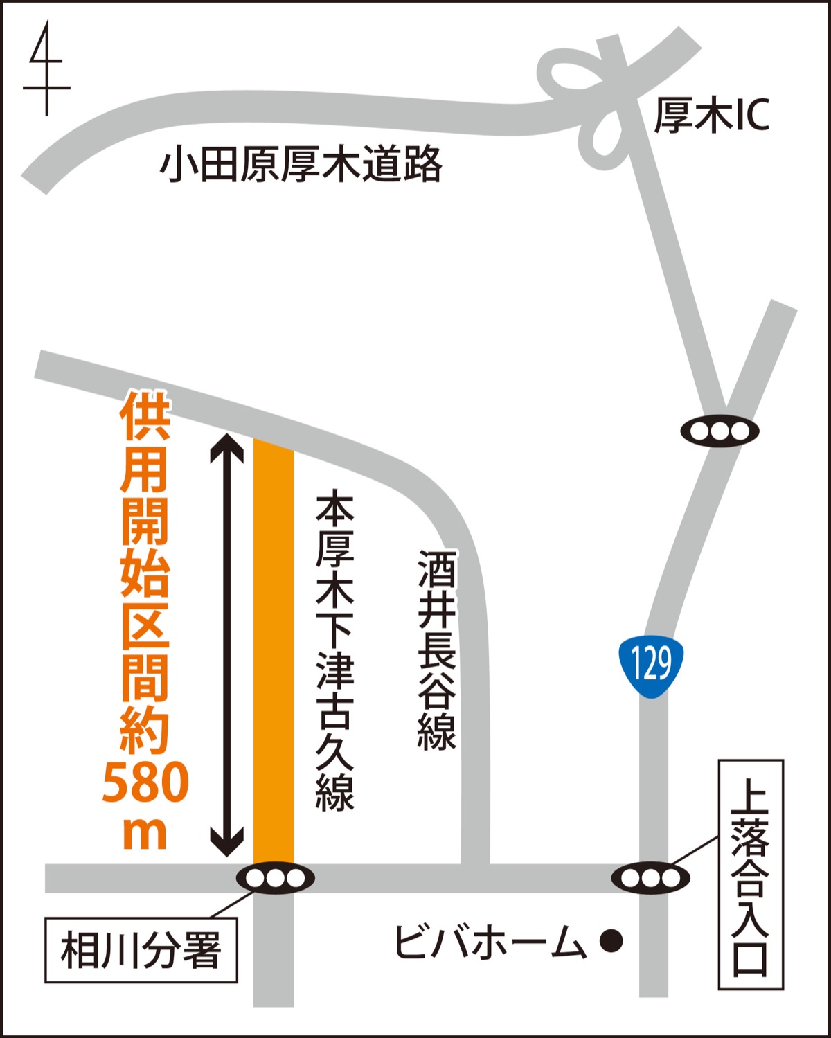 今回開通するのは、厚木市酒井1046の1から下津古久629の3に至る区間(都市計画道路酒井長谷線・交差部〜市道酒井上落合線)で、供用延長は約580m。路線総延長4160mの一部が部分開通することになる。市交通混雑対策課によると、全線の開通時期は未定だという。