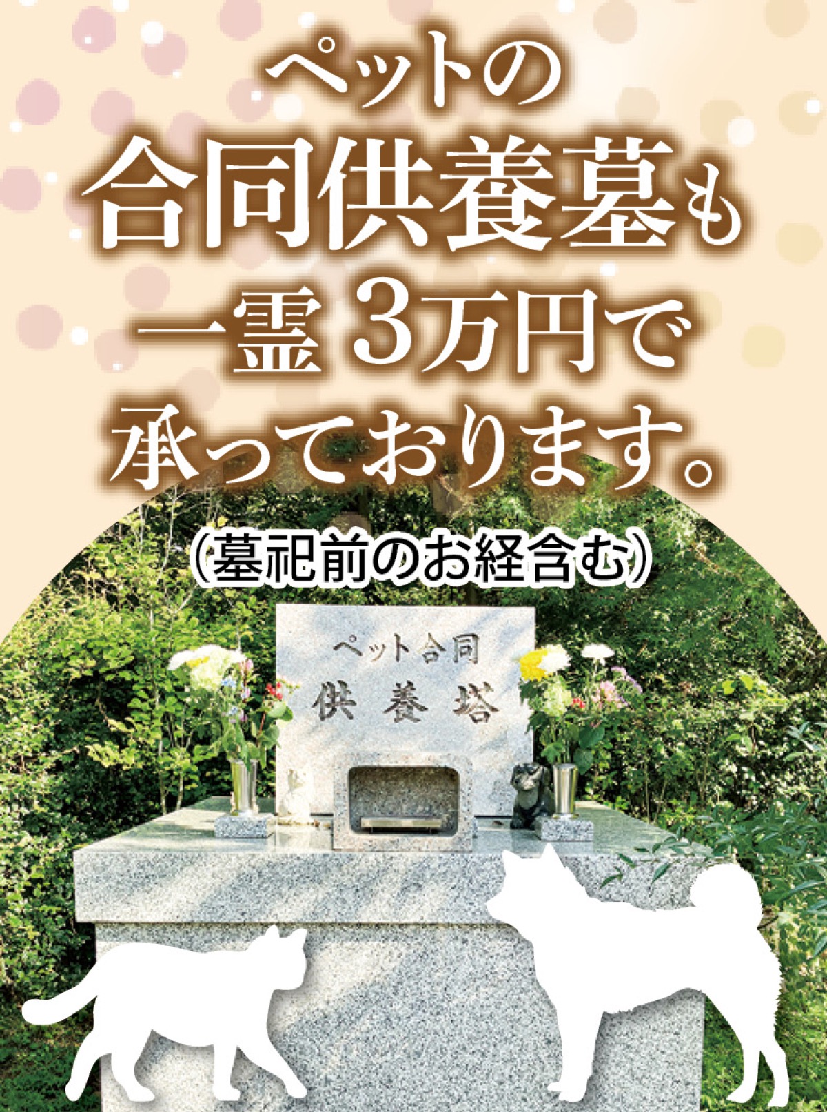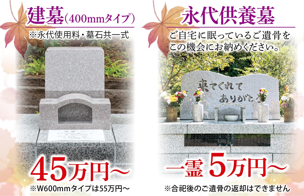 樹木墓は永代使用料・税込27万円〜(家銘板費等別途)、5霊納骨可能で2霊目からは5万円の手数料のみで納骨可(回向料別途)。永代供養墓は1霊税込5万円〜。ペット合同供養墓は1霊税込3万円〜。一般墓や建墓もあり。葬儀法要は佛光寺住職が執り行う。