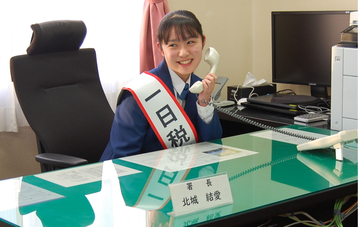 一日税務署長に任命されたのは、中学生の「税についての作文」コンクールで、厚木税務署長賞を受賞した坂倉凪砂さん(厚木中3年)、三浦万依さん(愛川中3年)と、全国納税貯蓄組合連合会優秀賞を受賞した北城結愛さん(愛川中原中3年)の3人。