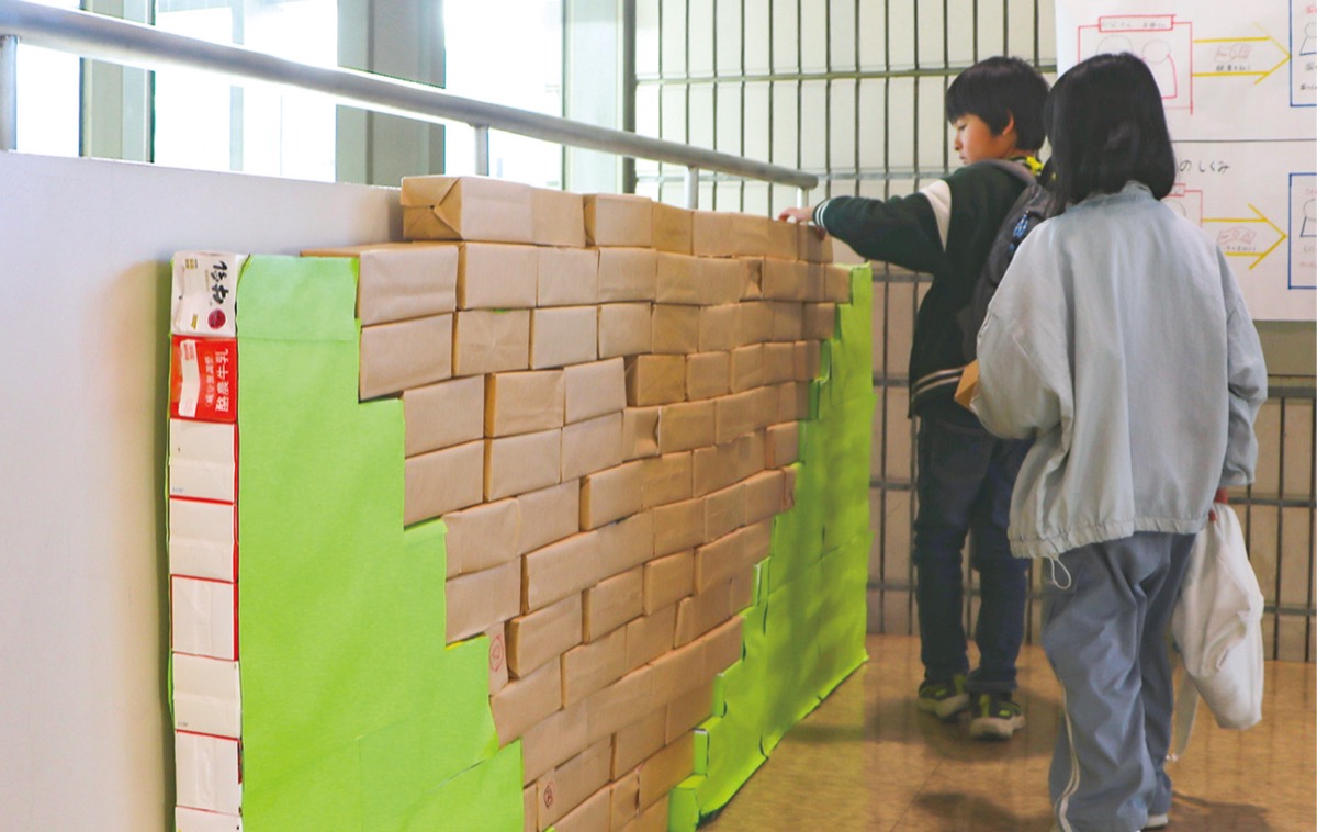 一方、税金に見立てたブロックは、会場内の手製ダムに堤防を作るように積み上げられた。これは公共事業の仕組みをイメージしたもので、納税によって町の施設などが整っていく過程が視覚的に再現された。子どもたちは売買や納税の実体験を通じ、笑顔で交流を深めていた。