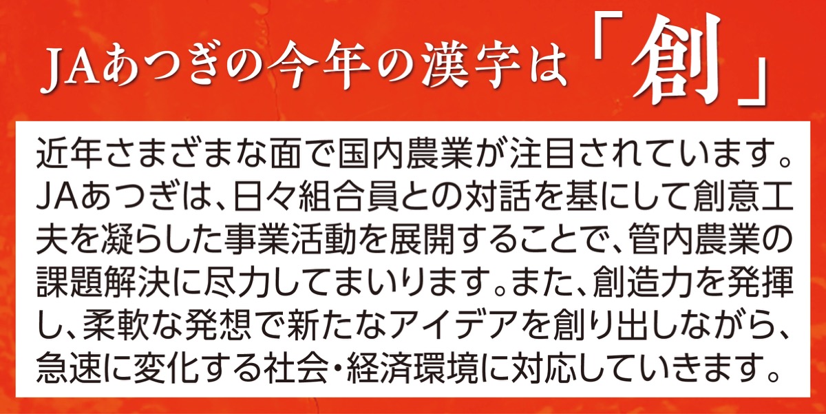 また「午年」は、古来より「前進」や「発展」の象徴とされています。JAあつぎの挑戦と飛躍の年とするため、前例にとらわれず「創造力」を発揮し、「創意工夫」を凝らした事業活動を展開するとともに、柔軟な発想で新たなアイデアを「創り出し」ながら、急速に変化する社会・経済環境に対応してまいります。
