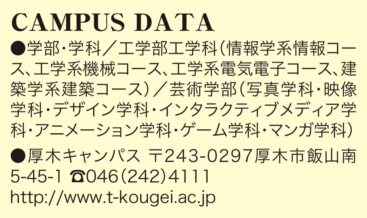 東京工芸大学はその名の通り、工学部(厚木市飯山南)と芸術学部(東京都中野区)にキャンパスを持ち、その融合で未来を創る学生を輩出し続けている。