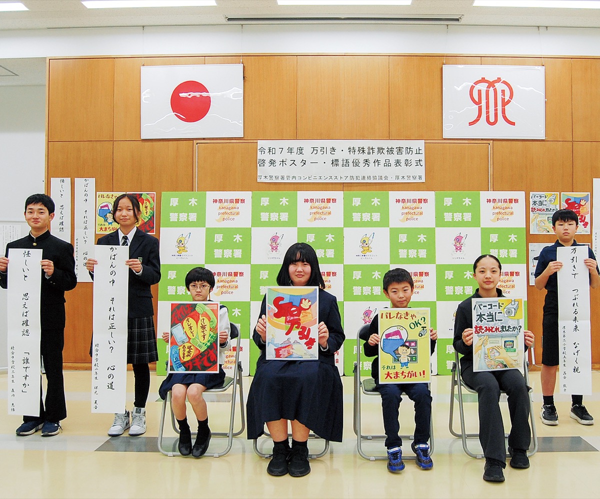 厚木警察署長賞▽万引き防止ポスター優秀・錦戸柚乃さん(厚木中1年)▽特殊詐欺防止ポスター優秀・成井しおりさん(小鮎小5年)▽特殊詐欺防止標語優秀・保元夏音さん(睦合中2年)▽特殊詐欺防止標語優秀・森内恵悟さん(同中2年)