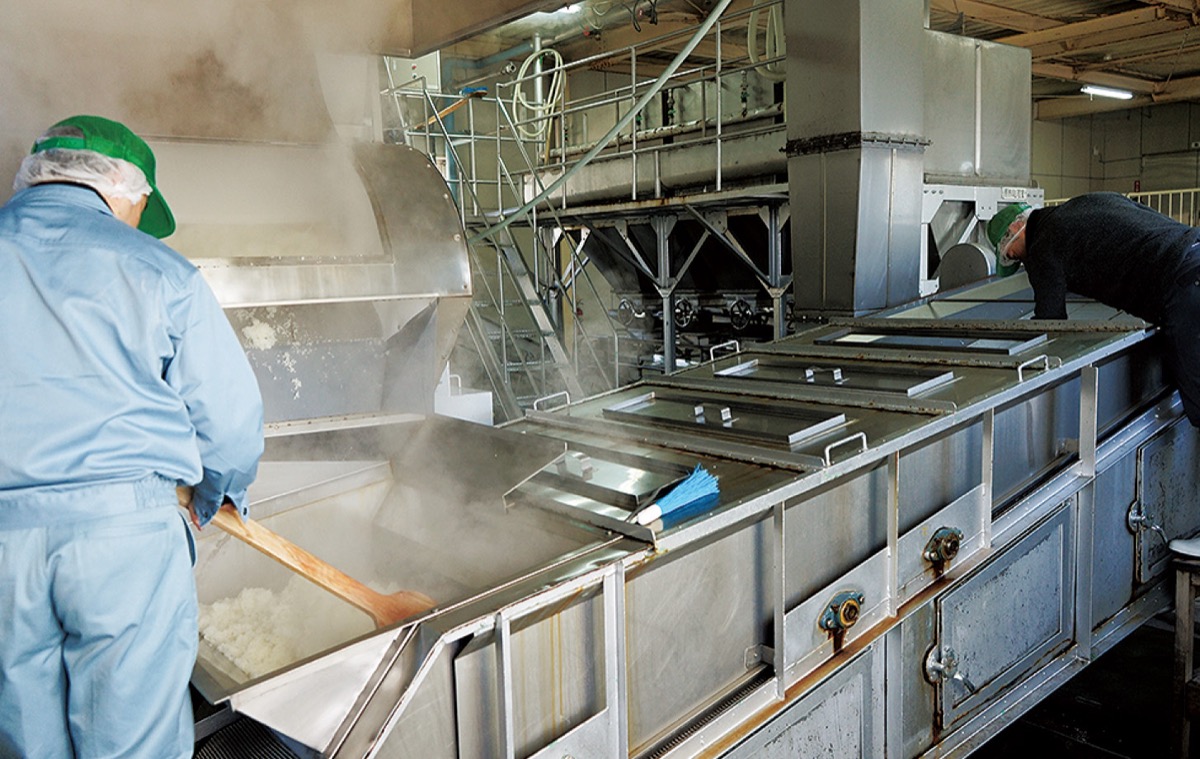 この日は立春朝搾りの2回目の仕込み作業。日本酒の元となる「もろみ」を作るため、職人たちの手で蒸しあがった酒米と麹が仕込みタンクに入れられ、丁寧にかき混ぜられた。