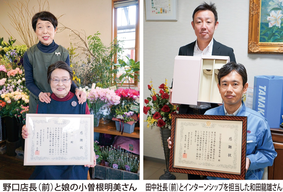県立高校のインターンシップ推進に尽力した企業などを表彰する「かながわインターンシップ推進優良企業・団体等表彰」が1月7日、県立総合教育センター(藤沢市)で行われた。受賞11団体に、田中紙業株式会社・厚木工場(田中伸尚代表取締役社長/厚木市上依知)と花のお店花野(野口雅子店長/愛川町田代)が選ばれた。