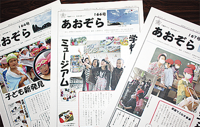 「あおぞら」は同校PTAの広報役員4人(写真)が取材や編集を手分けして行い、今年度は6号を発行。学校行事や子どもたちの学校での表情を紙面を通じて分りやすく伝えてきた。