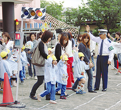 当日は、2班に分かれた園児たちが、ホールでスライドを使って交通安全を学び、園庭では信号機を使って親子で横断歩道の渡り方を学んだ。