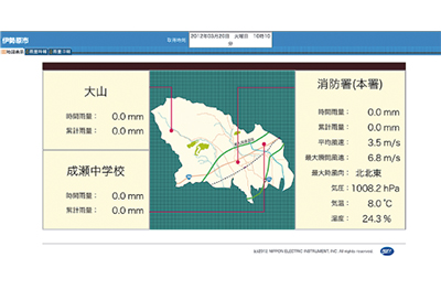 このマップは、各家庭の防災対策のひとつとして作成されたもの。市内大山(茶湯寺北側)、成瀬中学校(高森2丁目)、伊勢原市消防本部(伊勢原3丁目)での時間雨量・累計雨量に加え、消防本部での風速や気圧、気温なども確認できる。