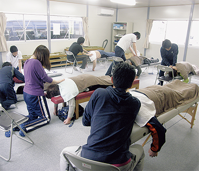 生徒を引率した井芹隆浩さんによると、慣れない仮設住宅に暮らす被災者の多くが肩や足腰の疲れを訴え「夜になっても眠れない」という相談が多かったという。井芹さんは「身体に触れながら会話をすることで、少しの間でも心が休まってくれれば。そんな思いで整体をしました」と振り返る。