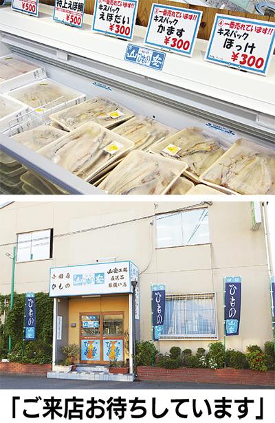 小田原で創業149年、江戸時代から続く味の老舗『山安のひもの』の直売所が厚木市温水にある。店内にはアジやホッケ、サンマをはじめとする塩味抜群の「ひもの」がズラリ。バラ売りは100円〜、お徳用パックは6〜8枚の「ひもの」が入ってなんと300円〜と、毎日驚きの価格で店頭に並ぶ。人気商品はトロアジ、イカみりんで、特にキンメは大好評。飲食店の経営者も買いに訪れるほど。店内はリピーターや口コミで噂を聞きつけた客で毎日にぎわっている。