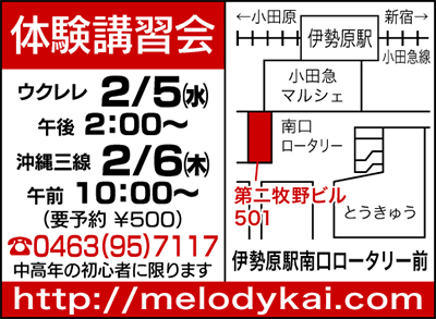 陽気なリズムが楽しいウクレレと、独特の美しい音色が大人気の三線を学びませんか。初級クラスの募集なので、やさしく楽しく学べます。メロディ会伊勢原教室では、初心者を対象に「はじめてのウクレレ教室」と「はじめての沖縄三線教室」を開催します。