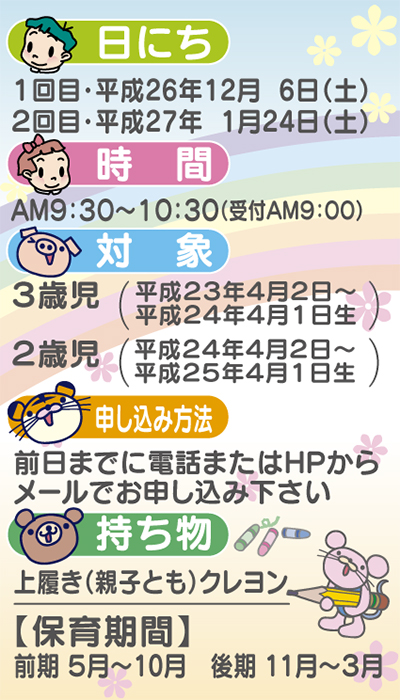 この教室では、専任教諭のサポートのもと、歌・体操・製作など八雲幼稚園の楽しさを思い切り味わえるよう、毎回工夫した保育を行っています。入会者からは「お友達もできるし、保護者同士の交流も持つことができる」と大好評。この笑顔あふれる「なかよし教室」の無料体験が12月と1月に開催されます。両日とも同じ内容なので、都合の良い日を選び前日までに申し込みを。体験終了後は園庭で自由に遊べるほか、「やくもとん汁」も味わえます。