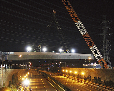 0時5分、国内最大級の大型クレーン「クローラクレーン」が白煙を上げながら93m・450tの橋梁を慎重に持ち上げ、東名と交差する形で旋回させた。明け方4時半過ぎには橋の両脇が土台に固定され、この日の工事は終了した。