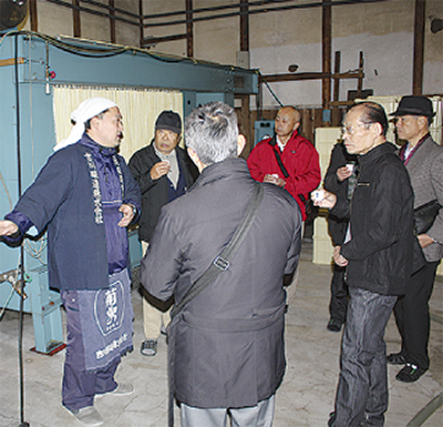 当日はおちょこを持った参加者たちが酒造りの説明を聞きながら、工程を見学してまわった。途中、しぼりたての酒を試飲するコーナーもあり、参加者たちは笑顔で身体を温めた。